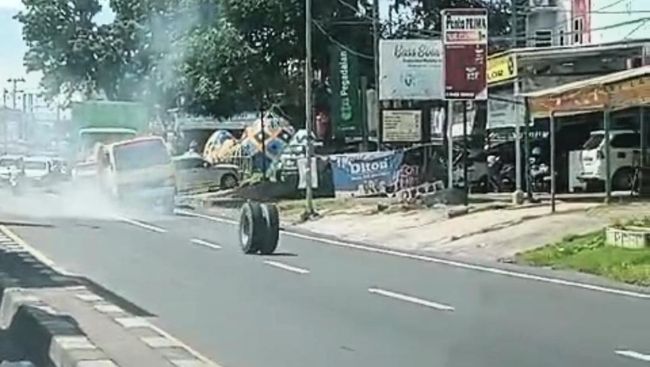 Viral sebuah video di media sosial (medsos) memperlihatkan ban truk yang menggelinding di Jalan Poros Maros-Makassar, Sulawesi Selatan (Sulsel). Ban truk yang copot menggelinding hingga menghantam gerobak pedagang es teler hingga rusak.