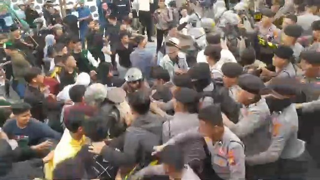 Sementara dalam video beredar, tampak massa aksi terlibat saling dorong dengan aparat kepolisian yang melakukan pengamanan. Selain itu, terlihat aksi saling lempar.