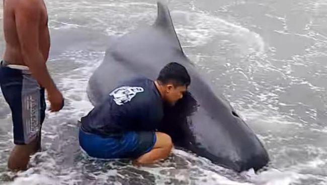 Berdasarkan video beredar yang dilihat detikcom, terlihat dua ekor paus terdampar di pinggir pantai. Tampak sejumlah warga berusaha mendorong paus tersebut ke tengah laut di tengah ombak yang deras.