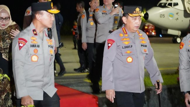 Jenderal Listyo Sigit Prabowo dan rombongan PJU Mabes Polri tiba di Bandara SAMS Sepinggan Balikpapan, Jumat (16/8) malam. Selian menghadiri perayaan upacara, kedatangan polisi nomor satu di RI untuk mengawal agenda Presiden Joko Widodo (Jokowi).