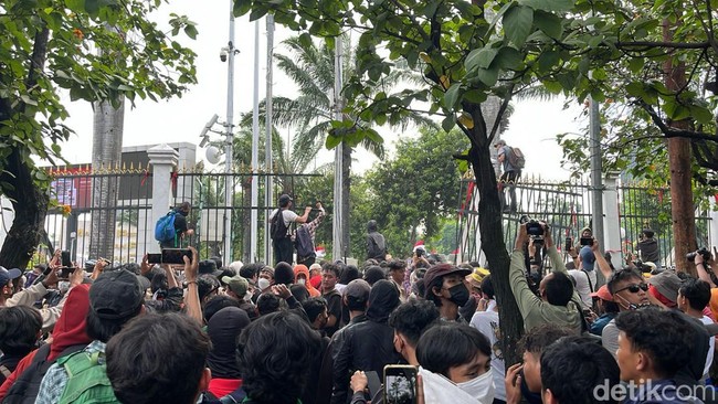 Sejumlah pendemo kemudian terlihat naik ke pagar. Pagar gerbang DPR selanjutnya terbuka cukup lebar usai jebol.