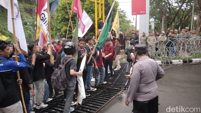 Pantauan detikcom, Jumat (23/8/2024) pukul 14.00 Wita, aksi demonstrasi mahasiswa itu awalnya berjalan damai. Massa bergantian orasi menyampaikan aspirasi.