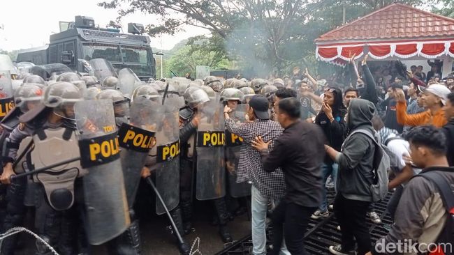 Pantauan detikcom, Jumat (23/8/2024) pukul 17.00 Wita, mahasiswa dan aparat kepolisian terlibat aksi saling dorong. Aparat pun mengimbau agar mahasiswa tidak melempar batu.