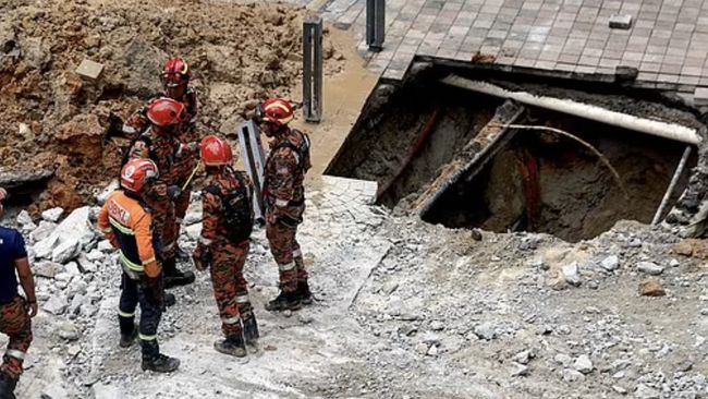 Pihak berwenang mengatakan sebagian saluran pembuangan beton besar di dasar sinkhole pecah. Korban mungkin jatuh ke dalam dan tersapu. Hujan deras di Kuala Lumpur beberapa minggu terakhir menyebabkan banyak air bergerak cepat di saluran pembuangan, mempersulit upaya pencarian.