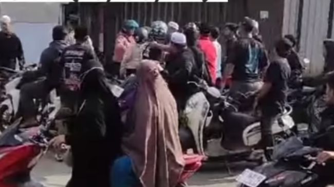 Dalam video beredar, tampak rombongan pengantar jenazah mengerumuni pengendara motor yang merupakan pasangan suami istri. Rombongan pengantar jenazah itu kemudian menganiaya pasutri tersebut.