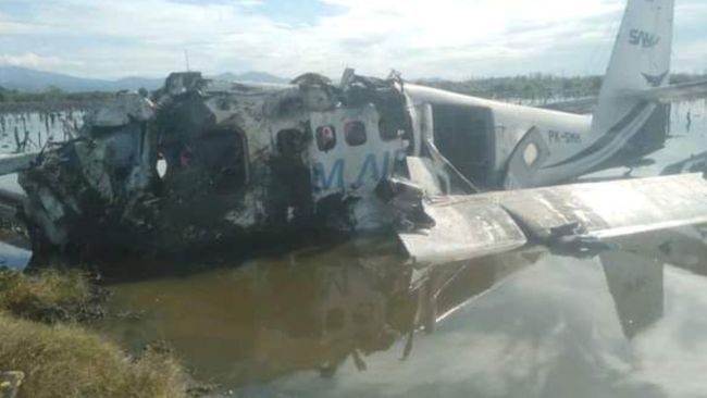 Selain itu, sayap pesawat sebelah kiri terlihat patah. Sementara sejumlah petugas tampak berada di lokasi untuk melakukan evakuasi.