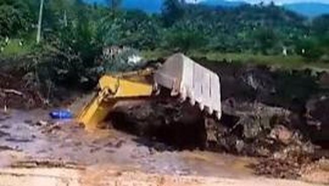 Tampak satu ekskavator juga ikut terbawa tanah yang bergerak hingga tertelan lumpur. Terlihat satu truk, minibus dan sepeda motor tidak bisa melintas karena jalan terputus.