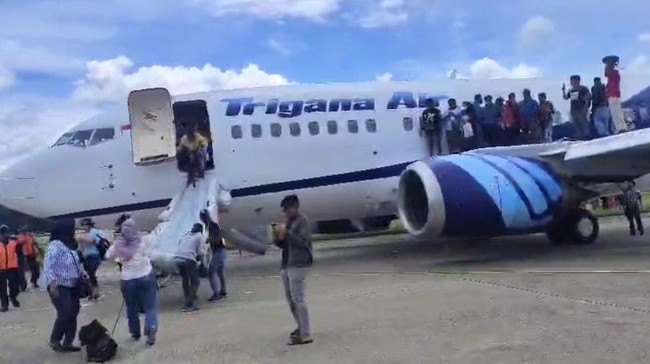 Diketahui, pesawat Trigana Air dengan kode penerbangan IL237 tipe Boeing 737500 batal terbang ke Wamena. Penumpang membuka pintu darurat karena panik.