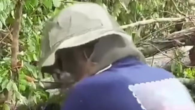 Selanjutnya, mereka terlihat beristirahat sambil mengemas barang bawaannya di tengah kerubungan lebah. Mereka tampak mengenakan jaring kain untuk menutupi kepalanya dari sengatan lebah.