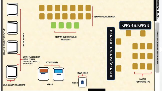 - Tempat duduk Pemilih yang menampung paling sedikit 25 (dua puluh lima) orang, yang ditempatkan di dalam TPS di dekat pintu masuk TPS;
