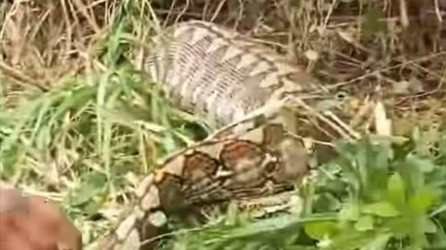 Saat proses pencarian, warga mendapati ular tersebut berada di semak-semak. Kondisi perut membuncit dan kesulitan bergerak.