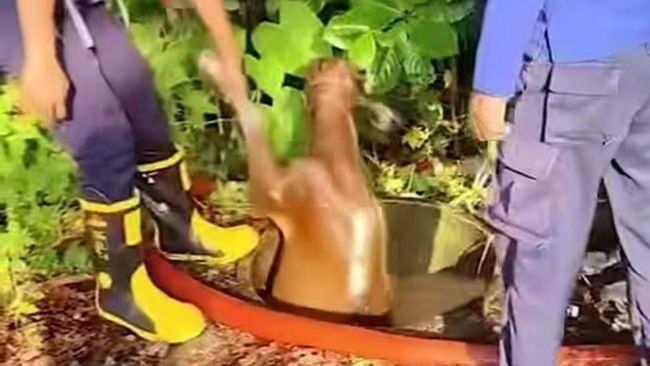 Seekor anak sapi jantan terjatuh dan terperangkap ke dalam sumur milik warga di Kabupaten Maros, Sulawesi Selatan (Sulsel). Tim Rescue Damkar Maros yang menerima laporan langsung melakukan evakuasi terhadap sapi yang terjebak dalam sumur sedalam 8 meter itu.