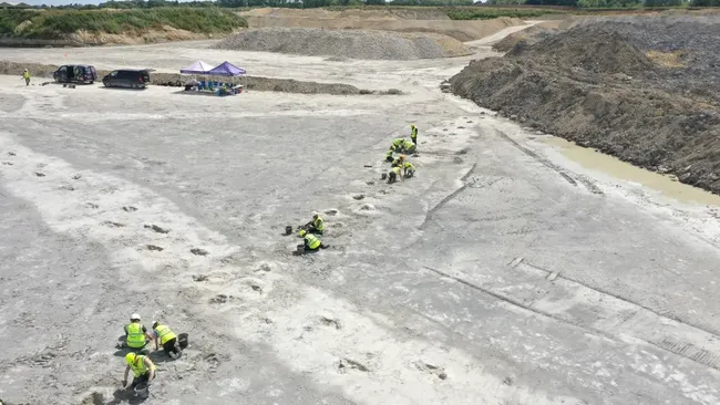 Pekerja di Tambang Dewars Farm, Oxfordshire, Inggris tidak sengaja menemukan ratusan jejak kaki dinosaurus. Jejak kaki yang berusia sekitar 166 juta tahun itu membentuk lintasan yang dilalui oleh hewan purba itu.