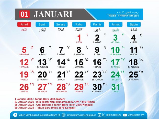 Berikut rincian kalender Hijriah sepanjang bulan Januari 2025: