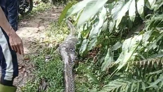 Ular piton berukuran 5 meter memangsa anak sapi milik warga di Kabupaten Luwu Utara (Lutra), Sulawesi Selatan (Sulsel). Hewan melata itu kemudian mati ditebas warga.