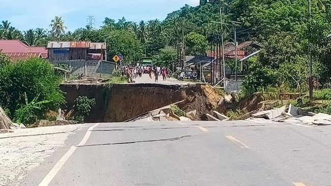 Jalan Trans Sulawesi di Kabupaten Poso, Sulawesi Tengah (Sulteng), amblas gegara tanah longsor usai wilayah tersebut diguyur hujan lebat seharian. Bencana ini mengakibatkan 3 rumah rusak berat dan 14 warga dievakuasi.