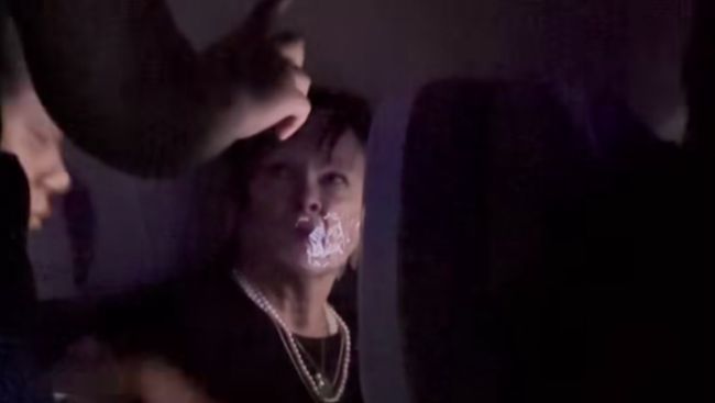 Pramugari yang kesabarannya habis kemudian mendatangi wanita itu dengan gulungan lakban. Dengan cepat ia mencondongkan tubuhnya ke wanita itu dan merobek gulungan lakban, lalu menutup mulutnya hingga pesawat tiba.