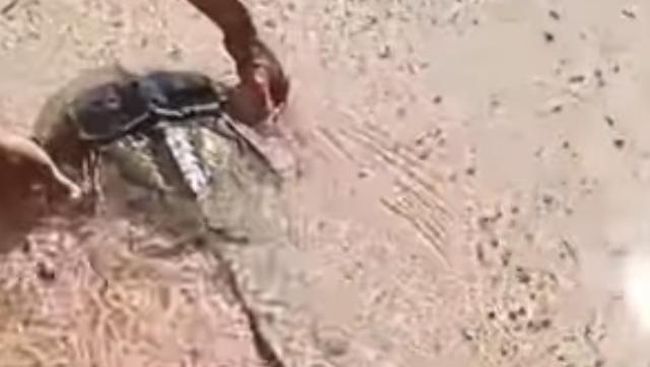Sementara dalam video beredar, tampak kepiting tapal kuda berwarna cokelat muda kombinasi hitam di pinggir pantai. Nelayan kemudian secara perlahan mengarahkan kepiting itu ke laut.