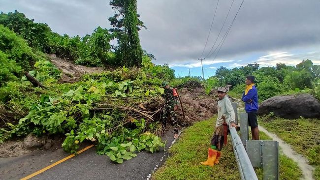 Dia mengatakan akibat longsor tersebut, arus lalu lintas di lokasi terputus total. Pasalnya, material longsor berupa tanah dan batu besar menutupi badan jalan sepanjang 20 meter.