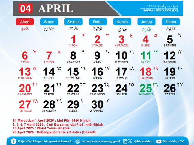 Berikut rincian kalender Hijriah sepanjang bulan April 2025: