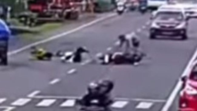 Akibatnya, pengendara motor bersama boncengannya terpental ke aspal. Sementara, pejalan kaki yang sempat tersungkur langsung bangkit lalu menuju sepeda motornya di seberang jalan dan meninggalkan lokasi.
