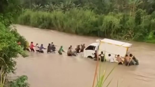 Dalam video yang dilihat detikcom, tampak puluhan warga berjuang mengevaluasi mobil box berwarna putih yang terjebak di tengah aliran sungai berarus deras.