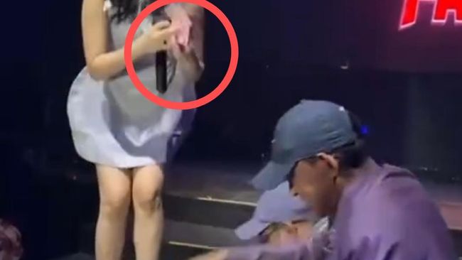 Pria itu mengenakan topi hitam dan jaket kulit warna hitam. Dia pun terlihat berkali-kali memberikan uang pecahan Rp 100 ribu ke DJ wanita yang sedang bernyanyi.