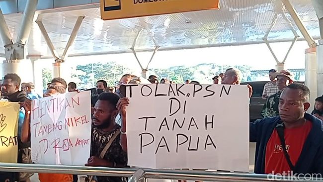 Pantauan detikcom di lokasi, Sabtu (7/6/2025), Bahlil dan rombongan tiba di bandara sekitar pukul 06.22 WIT. Sementara massa sudah berkumpul di area pintu kedatangan menggelar demo.