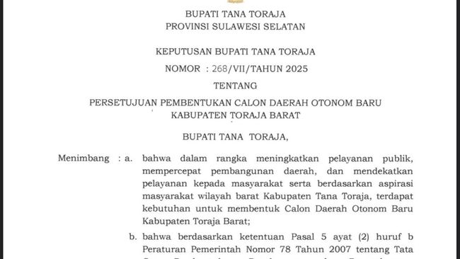 Keputusan itu tertuang dalam surat Bupati Tana Toraja Nomor: 268/VII/2025 tentang Persetujuan Pembentukan Calon Daerah Otonom Baru Kabupaten Toraja Barat. SK tersebut diteken Zadrak pada 11 Juli 2025.