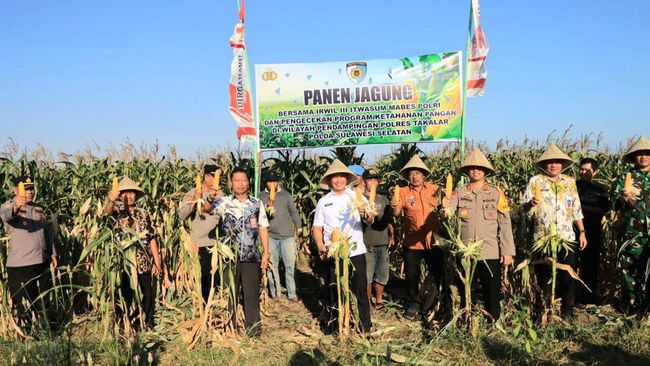 Irwil III Itwasum Polri Brigjen Herukocho turun langsung memimpin panen jagung di Kabupaten Takalar, Sulawesi Selatan (Sulsel). Panen jagung tersebut merupakan bagian dari program ketahanan pangan nasional menuju swasembada 2025.
