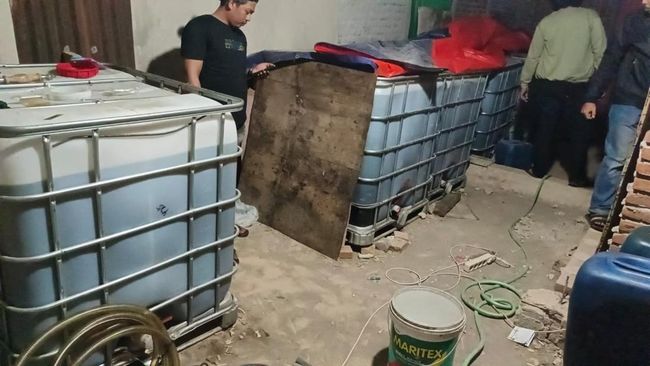 Polisi menggerebek lokasi penimbunan bahan bakar minyak (BBM) subsidi jenis solar di salah satu rumah kosong di Kabupaten Maros, Sulawesi Selatan (Sulsel). Sebanyak 9 ribu liter solar diamankan dari lokasi.