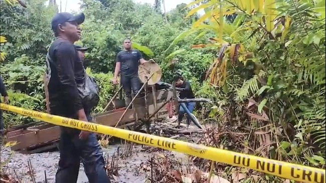 Dari video yang dilihat detikcom, tampak polisi menggerebek lokasi tambang di tengah hujan deras. Mereka mengamankan mesin dan pipa yang dipakai menambang. Polisi juga memasang police line di lokasi.