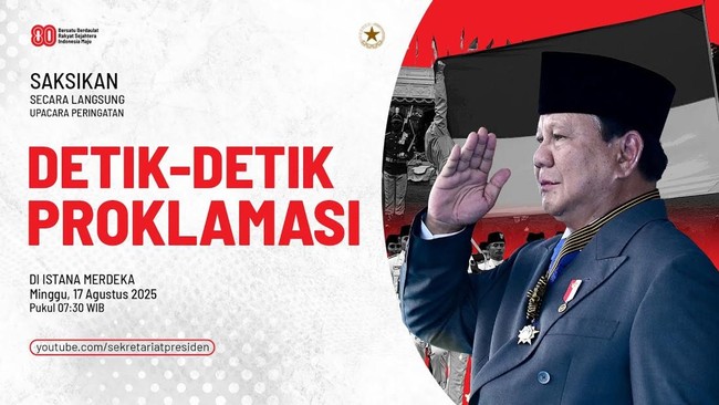 Upacara Detik-detik Proklamasi memperingati Hari Ulang Tahun (HUT) ke-80 RI di Istana Merdeka, Jakarta, akan digelar hari ini, 17 Agustus 2025. Bagi detikers yang tidak bisa hadir langsung, kini tersedia link live streaming upacara 17 Agustus 2025 agar tetap bisa menyaksikan rangkaiannya.