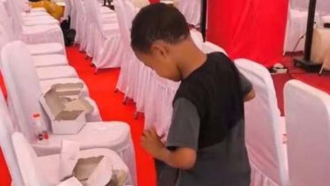 Dalam video beredar, seorang bocah tampak membuka satu per satu kotak kue. Bocah itu tampak jongkok lalu mengambil kue sisa yang berada di dalam kotak makanan.
