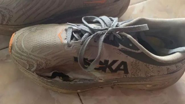 Sementara dalam postingan di media sosial, tampak sepatu bermerek Hoka. Terlihat jelas bahwa terdapat kerusakan di bagian samping sepatu tersebut.