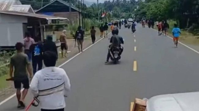 Sementara dalam video beredar, tampak banyak pria membawa senjata tajam seperti parang dan tombak. Mereka terlihat berlari mengejar kelompok lain.