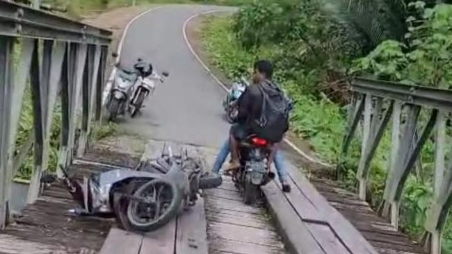 "Namun saat melewati jembatan itu, ban depan motor keluar jalur ke papan kayu bagian bawa. Selanjutnya hilang keseimbangan," jelasnya.