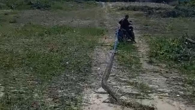 Warga di Konawe Selatan (Konsel) menyeret ular piton berukuran 7 meter menggunakan motor. Hewan melata itu dalam kondisi mati setelah ditebas saat hendak memangsa babi hutan.
