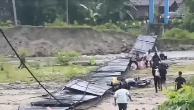 Jembatan gantung di Tolitoli, Sulawesi Tengah (Sulteng), putus saat dilewati rombongan warga yang hendak ke acara pengantin. Insiden itu mengakibatkan 4 orang mengalami luka-luka.