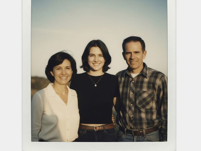 - Buatlah gambar yang diambil dengan kamera polaroid. Foto tersebut harus terlihat jelas dan seperti nyata, tanpa subjek atau properti yang jelas. Foto tersebut harus terlihat sedikit efek blur dan sumber cahaya yang konsisten, seperti lampu kilat di ruangan yang gelap, yang tersebar di seluruh foto. Jangan ubah wajah, ganti tirai belang menjadi tirai putih dan biarkan kelima orang berpose yang mesra dan lucu seperti keluarga.