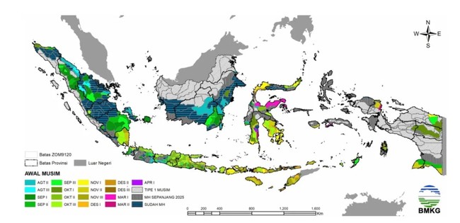 Berdasarkan buku tersebut, dijelaskan bahwa awal musim hujan di Indonesia tidak terjadi dalam waktu bersamaan. Sebagian wilayah Sumatera dan Kalimantan telah memasuki musim hujan sebelum September 2025.