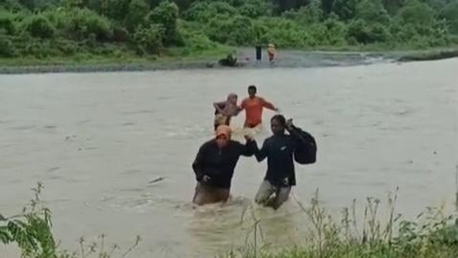 Dalam video beredar, tampak dua guru perempuan melewati sungai berarus deras dalam kondisi hujan. Tangan masing-masing guru itu dituntun dua pria agar tidak terseret arus.