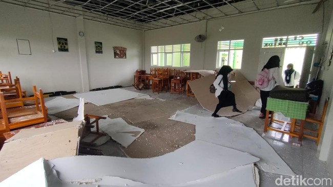 Pantauan detikcom, Sabtu (11/10/2025) di MAN 1 Polman, Desa Bonne-Bonne, Kecamatan Mapilli, tampak reruntuhan plafon masih berserakan dalam ruang kelas. Reruntuhan plafon itu menimpa sarana pembelajaran seperti meja dan kursi.