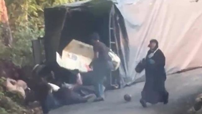 Para penumpang pun terjatuh sembari berteriak. Beberapa di antaranya bahkan saling bertumpuk saat truk terguling.