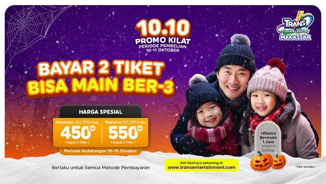 Tunggu Apalagi? Ajak keluarga, sahabat, dan orang tersayangmu untuk merasakan liburan spesial di Trans Snow World Makassar. Promo ini hanya berlaku hingga 15 Oktober 2023, segera pesan tiketnya sekarang di sini!