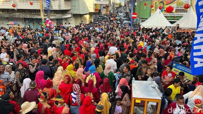 Pantauan detikSulsel di lokasi, Minggu (5/2/2023) sekitar pukul 16.40 Wita, terlihat warga Kota Makassar memadati lokasi berlangsungnya acara. Mereka terlihat sangat antusias untuk hadir di karnaval ini.