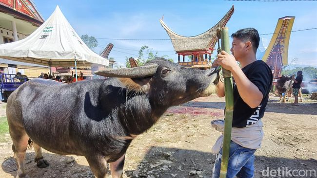 Tampak s(Rachmat Ariadi/detikSulsel).eorang pria sedang mempersiapkan seekor kerbau untuk acara ma'pasa tedong. Biasanya kerbau-kerbau tersebut bakal dijejer untuk disembelih. (Rachmat Ariadi/detikSulsel).