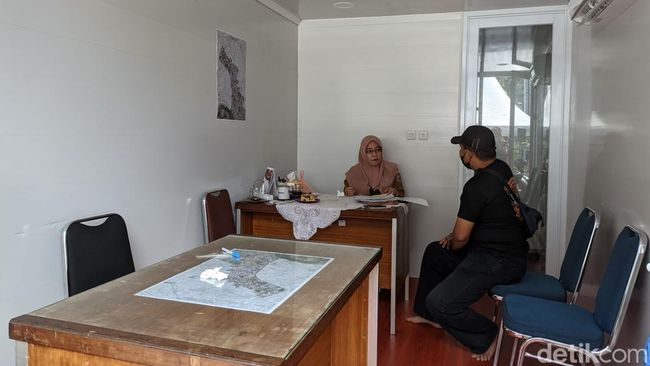Foto: Lurah Gunung Sari saat menerima tamu di dalam kontainer yang kini jadi ruangan kantornya. (Nurul Itiqamah/detikSulsel)