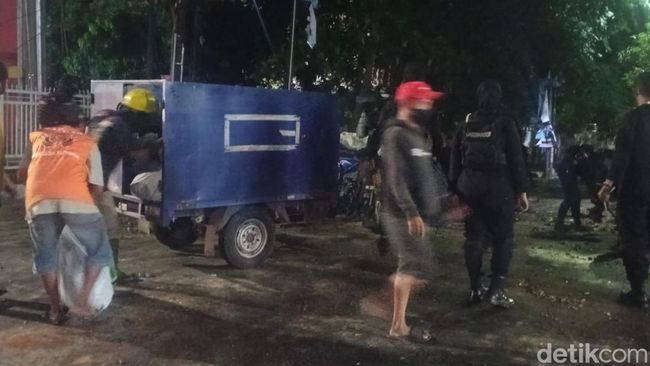 Foto: Petugas kebersihan mengangkut material sisa demo di sekitar kampus UNM. (Isak Pasa'buan/detikSulsel)