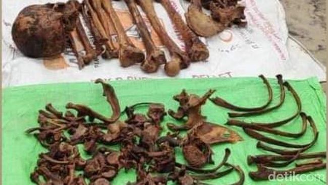 Kerangka manusia dikumpulkan warga usai makam tua di hantam ombak tinggi di Tanah Bumbu, Kalsel. Foto: Muhammad Budi Kurniawan/detikcom